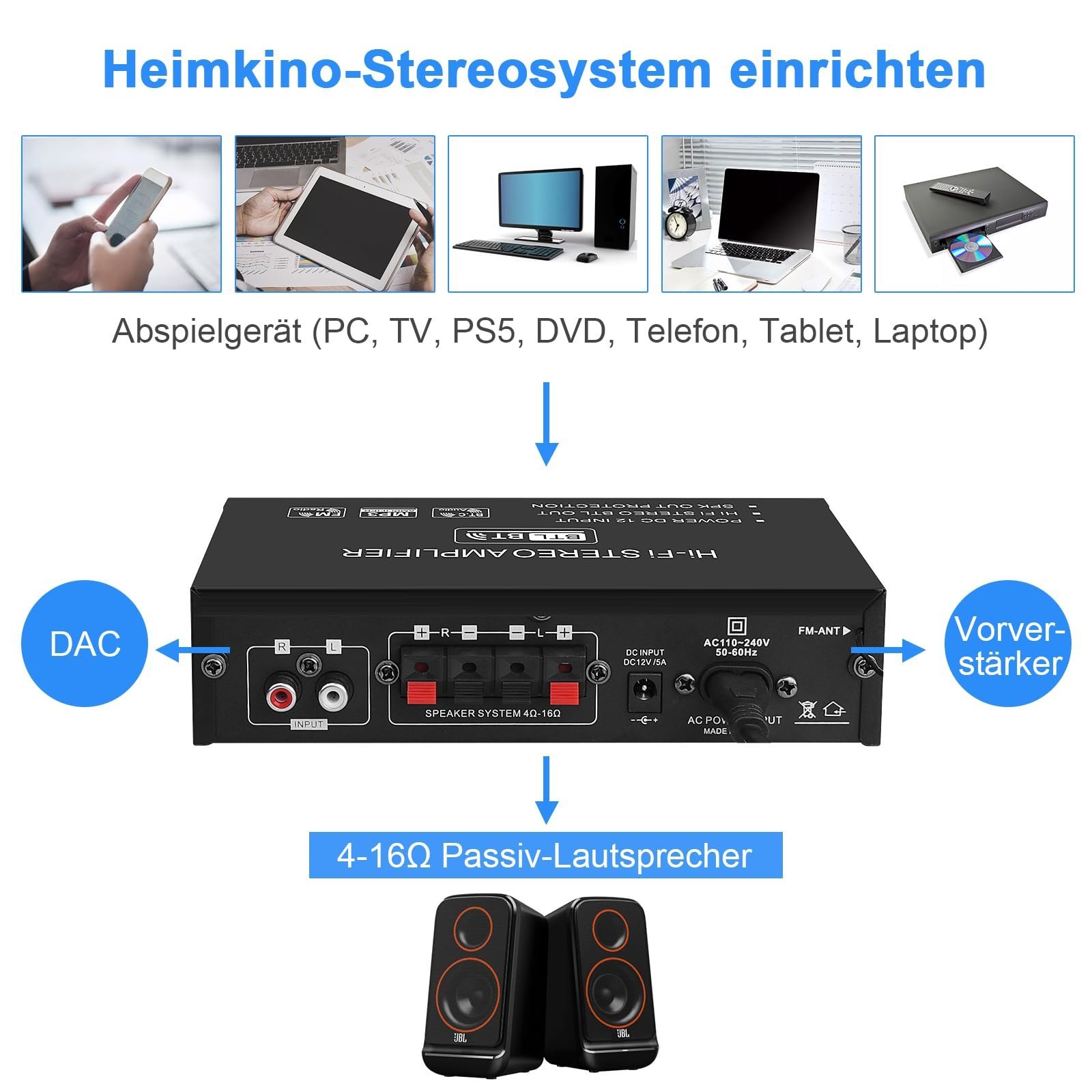 • Multiple Input ▶ This home audio power amplifier with Bluetooth, AUX, MIC, USB input, allows you to listen to audio from external devices, such as CD, DVD, TV, PC, computer, tablet, notebook, phone, MP3 and projectors with AV audio etc.