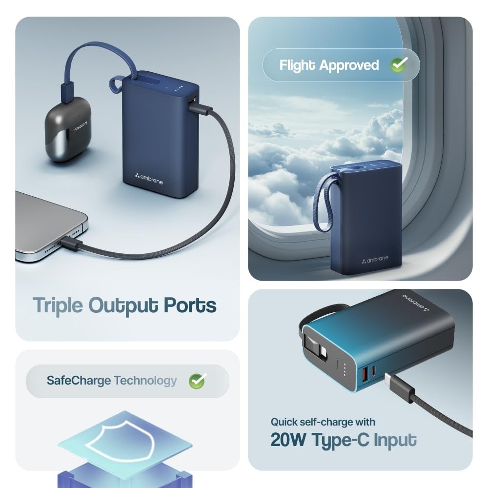 - Multiple Ports: Type C, In-built Type C cable, and USB-A for versatile charging.