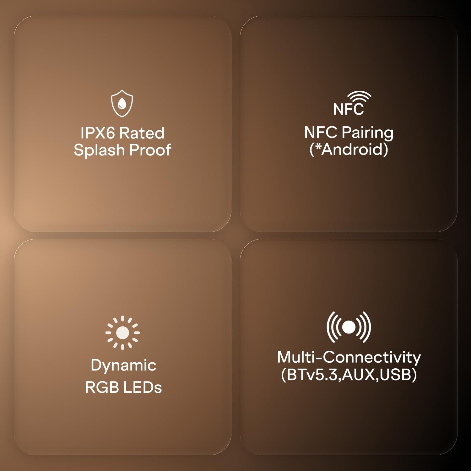 Details: Say hello to bigger sound, better vibes, and non-stop music with the boAt Nirvana Luxe Bluetooth Speaker. Nirvana Luxe brings together powerful performance and smart features to transform everyday listening. Boasting a 100 W bass-rich Signature Sound, it delivers deep lows and detailed audio that enhances everything from OTT marathons to the newest music releases. Additionally, boAt 360˚ Spatial Audio in this speaker creates a theatre-like effect for a realistic listening experience. Broadcast mode allows multiple Nirvana Luxe speakers to connect wirelessly, filling large spaces with sound that suits parties, movie sessions, or social gatherings. With the boAt Hearables app, you can easily customize sound settings and lighting effects. Moreover, you can enjoy instant playback on Android devices through simple NFC tap pairing. This speaker’s RGB lighting adds visual flair with three LED modes, while the long-lasting battery offers up to 15 hours of uninterrupted playback. Sporting a built-in mic, Nirvana Luxe enables clear hands-free calling. Enjoy the multiple connectivity options, such as AUX, USB (Type-C), and Bluetooth v5.3, that ensure seamless audio streaming. Designed for convenience, its ergonomic build with a carry strap combined with an IPX6 water resistance makes it easy to indulge in Nirvana Luxe at the gym, by the pool, or during beach outings!