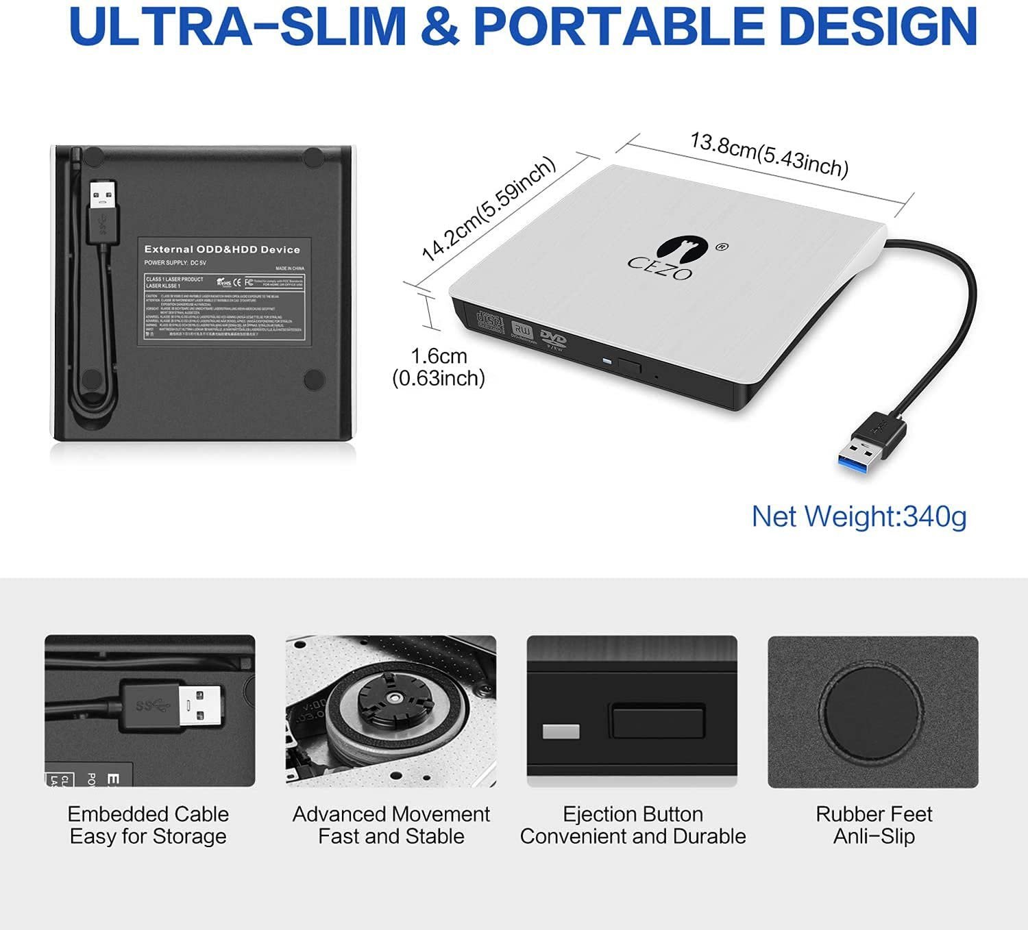 - Our External CD DVD Drive and the USB cable are combined in one.Embedded USB cable design, easy for storage.Ultrl Slim portable size is equipped with USB 3.0 high speed interface, bringing you faster data transfer speed and stable performance, compatible with USB 2.0 and USB 1.0. It has a slim,lightweight,shockproof design and stylish appearance.