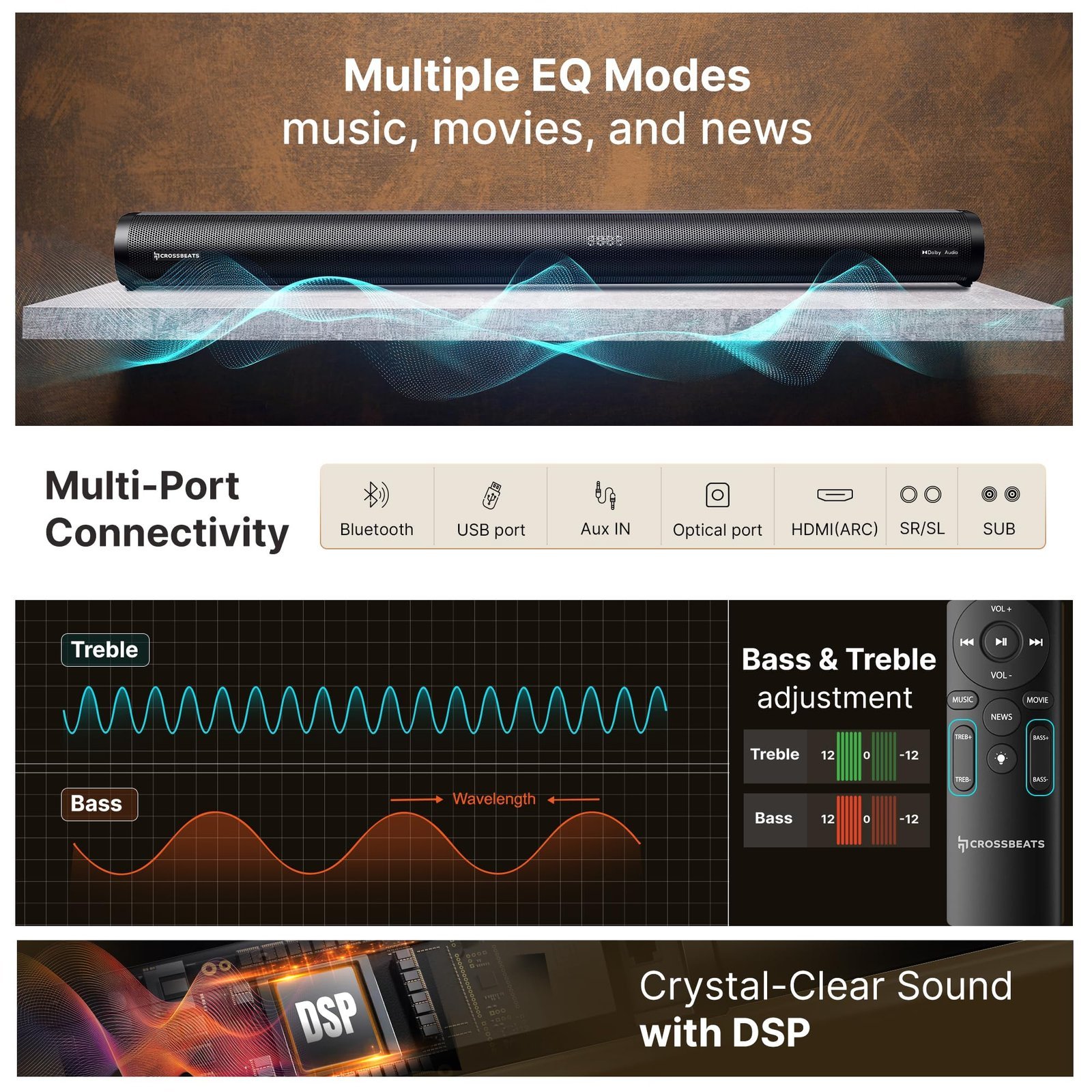 • ✅ Dedicated DSP Chip: The integrated Digital Signal Processor (DSP) enhances audio quality by balancing rich bass and clear vocals, delivering an optimized bluetooth soundbar experience for any content.