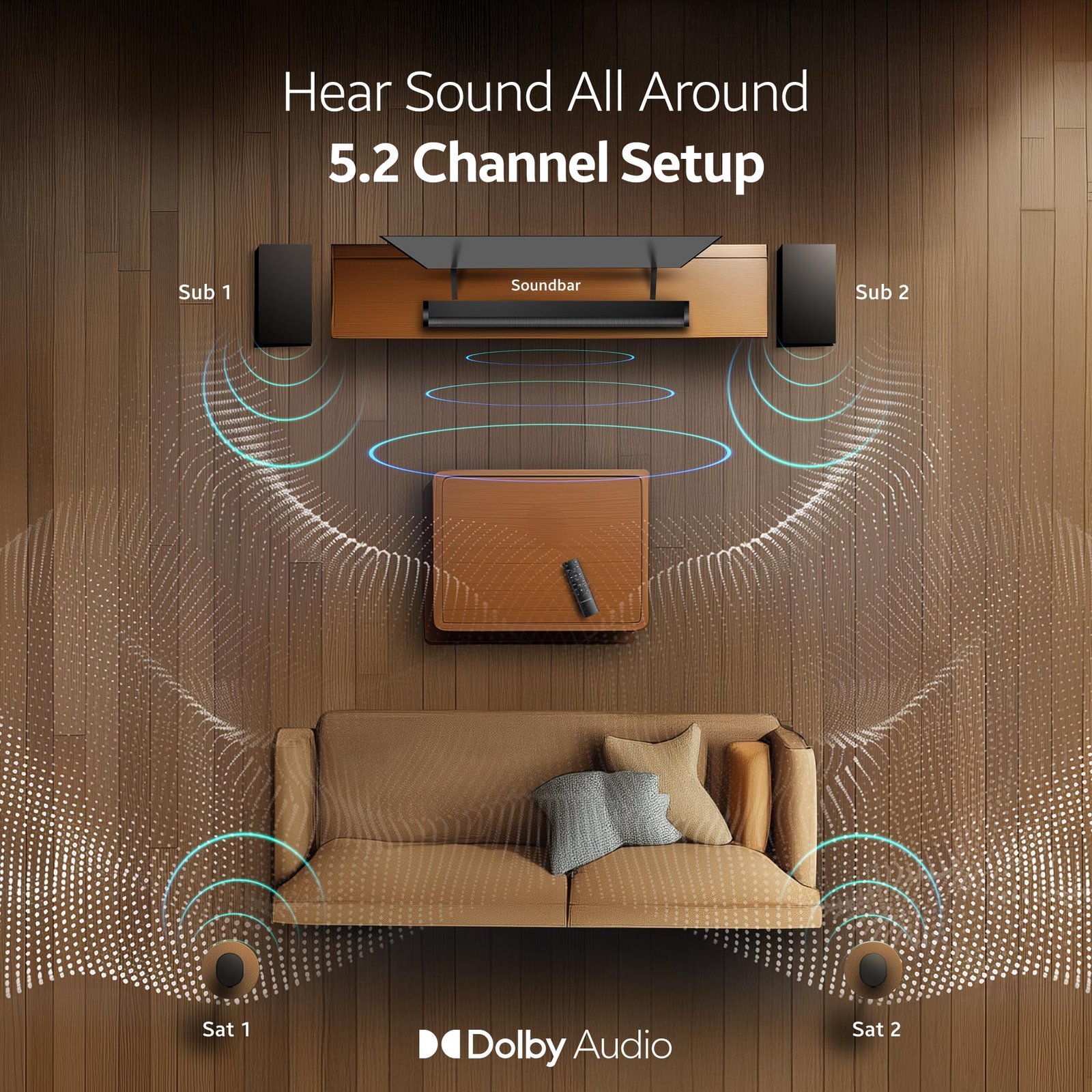 • ✅ Immersive 3D Home Theatre Sound Bar: Equipped with quad drivers, dual subwoofers, and satellite speakers, this 5.2 home theater delivers room-filling spatial audio—perfect for 5.1 dolby atmos movies, music, and gaming.