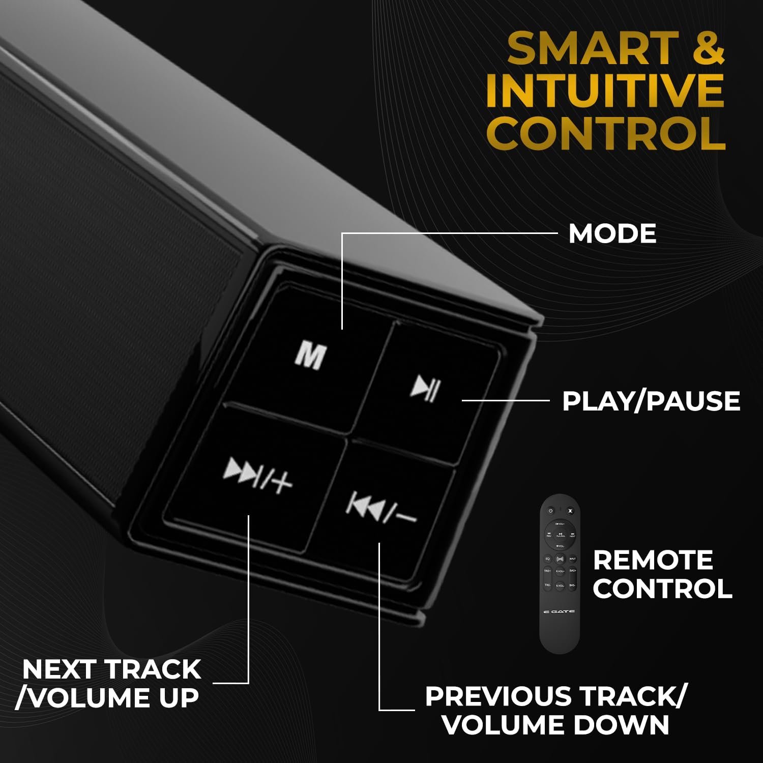 - 3EQ Mode & Advance One Click Remote: Ergonomically desined remote control with single click button for (A) Rear Volume Control (B) Swithc Between 2 Channel and 5.1 Channel (C) Dedicated button for Bass and Trebble