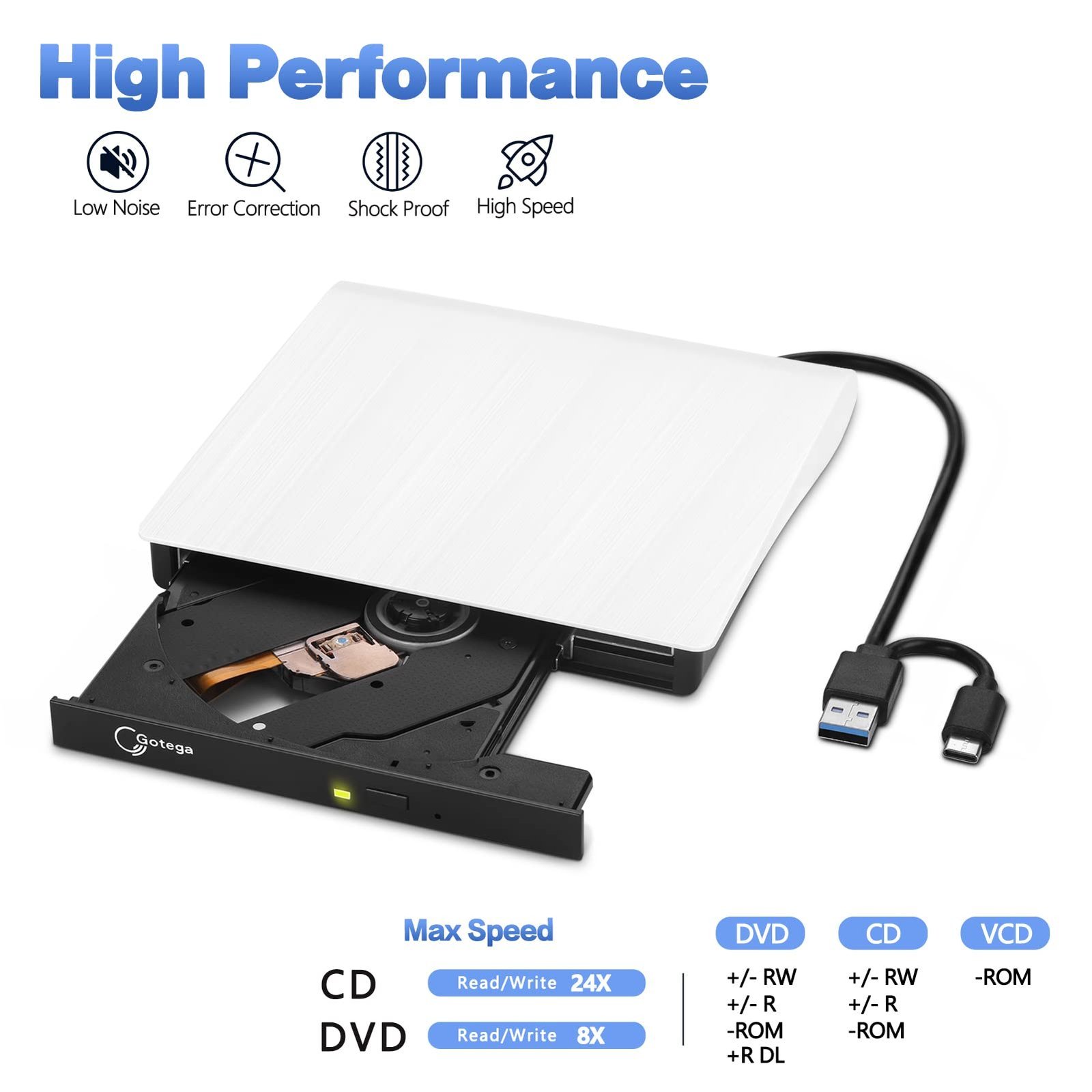 - High Speed – The external dvd drive for laptop TYPE-A and USB-Cdual connector is suitable for different computer model and personal need. The USB 3.0 cable of the usb dvd drive external provides high speed and backward compatible with USB 2.0 and USB 1.0, which enriches your choice. Max speed of the cd rom external drive for laptop for reading and writing CDs is 24X, and for DVDs is 8X. This dvd burner provides max 5Gbps data tranmission speed.