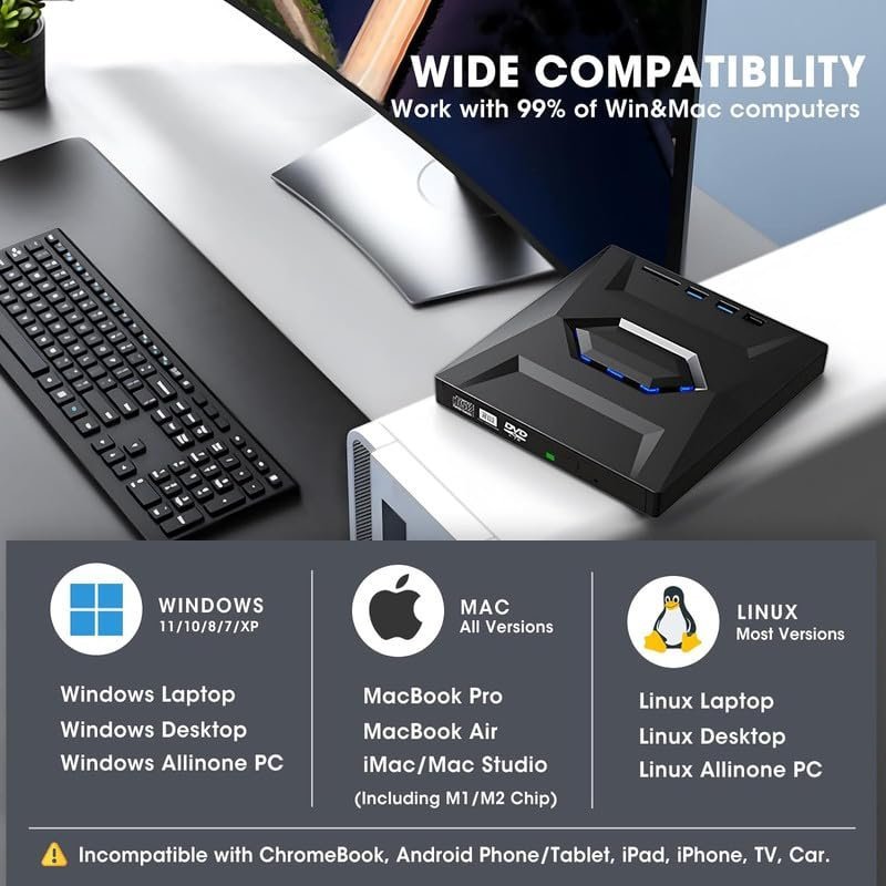 - ✅【Advanced USB 3.0 Technology】: Benefit from high-speed data transfer and stable performance with the dual-port USB 3.0 technology. This external DVD/CD drive ensures quick and reliable recording of CDs, music, videos, software installation, or creating backup discs. It’s also fully compatible with USB 2.0 and USB-C ports, eliminating the need for adapters.