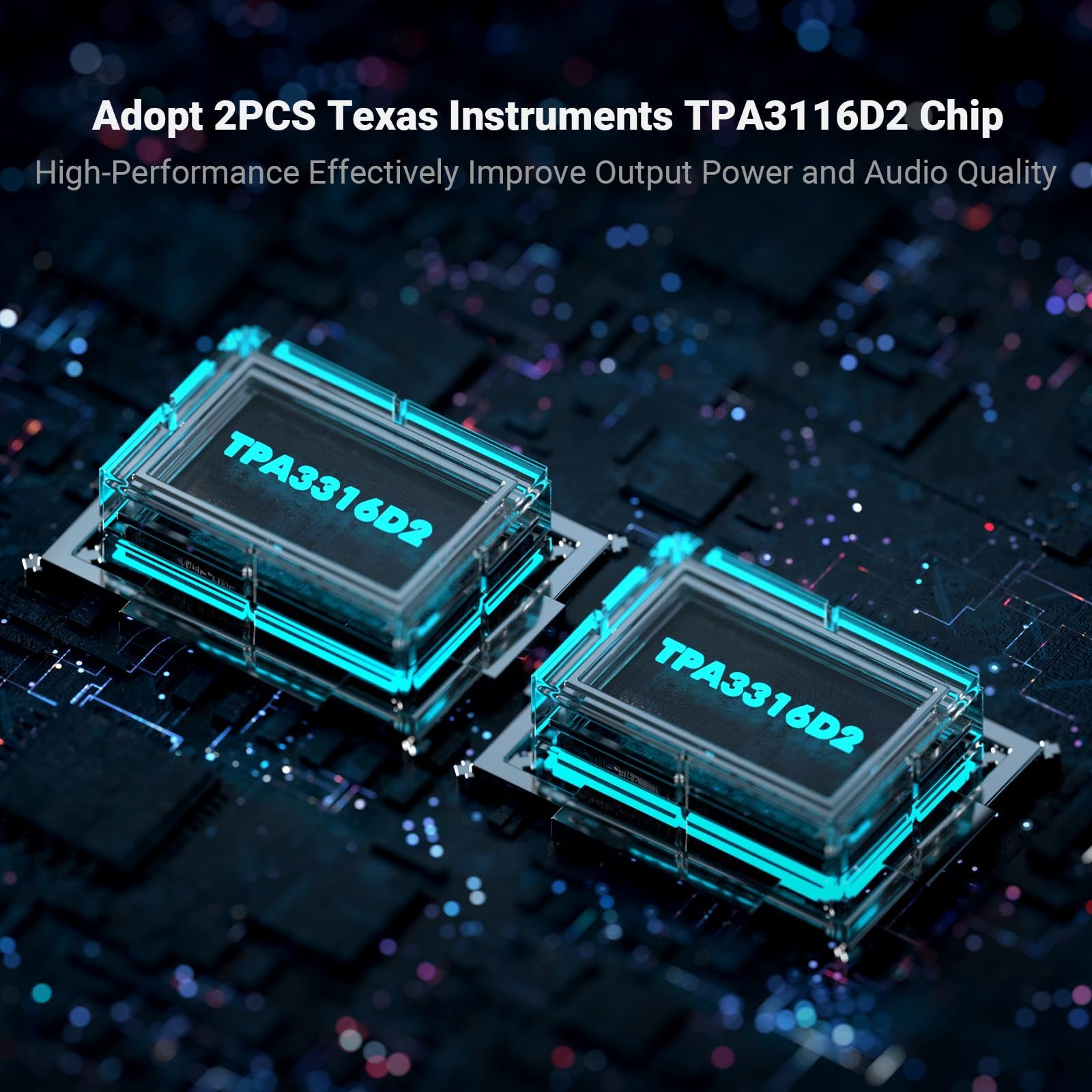 - BT30D wireless stereo amplifier adopts 2 pcs Texas Instruments TPA3116D2 chip. The TPA3116D2 are stereo efficient and digital amplifier power stage for driving speakers, with advanced oscillator/PLL circuit employs a multiple switching frequency option to avoid AM interferences. High-performance effectively improve output power and audio quality. Max power output up to 200Watt.