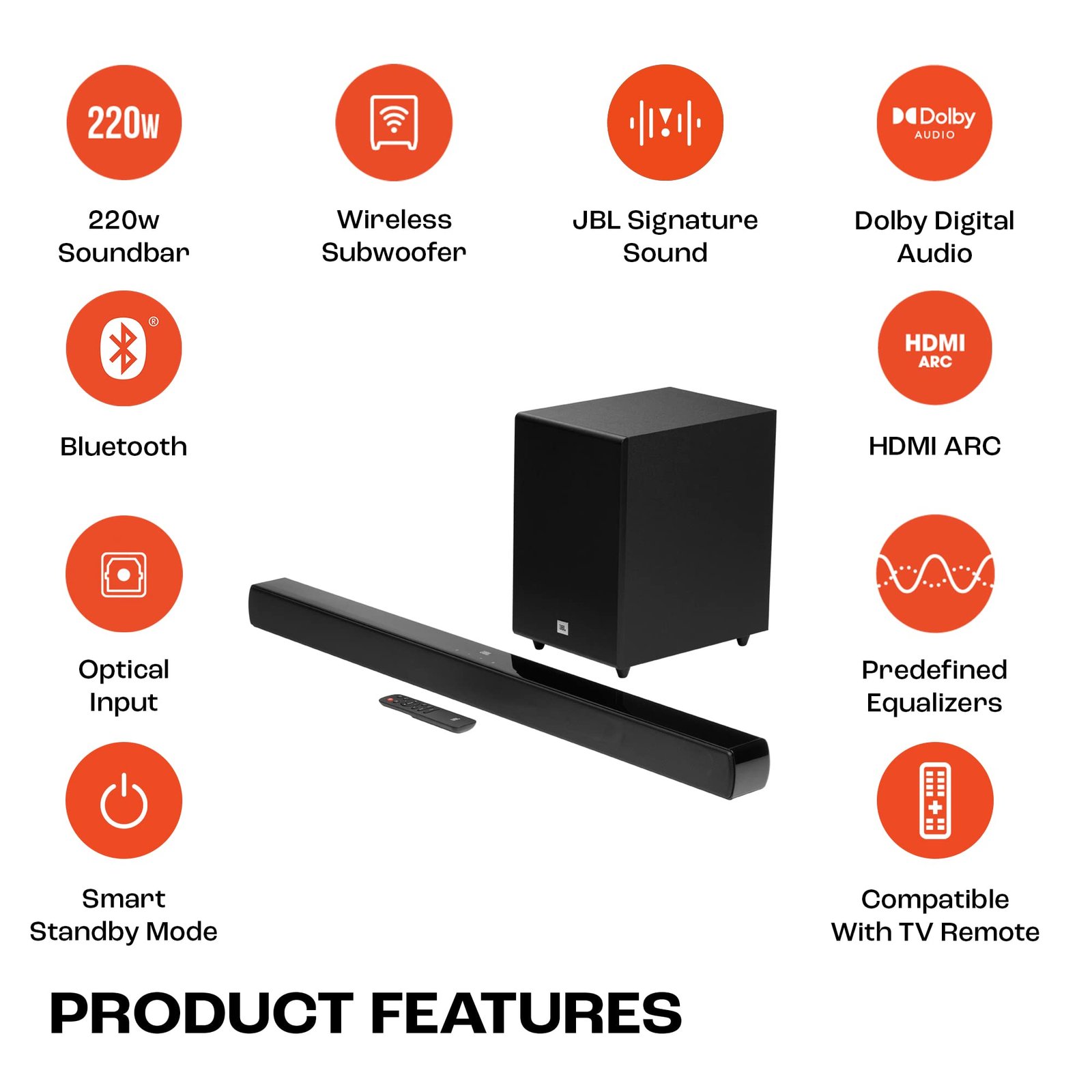 • 220W SOUNDBAR WITH WIRELESS SUBWOOFER: JBL Cinema SB271 delivers a massive 220 Watt of powerful sound from two full range drivers. The wireless subwoofer delivers deep and thumping bass and a clutter-free experience