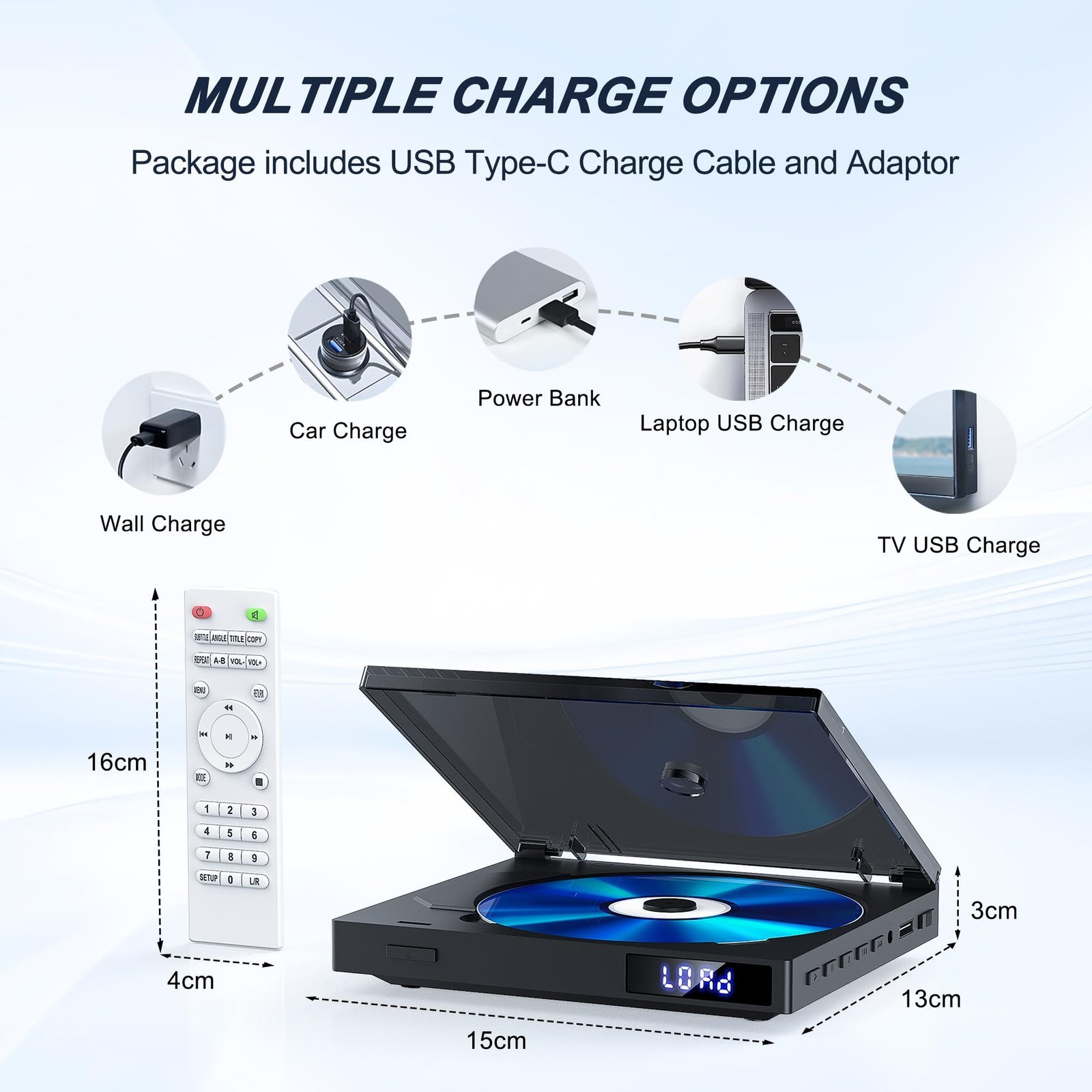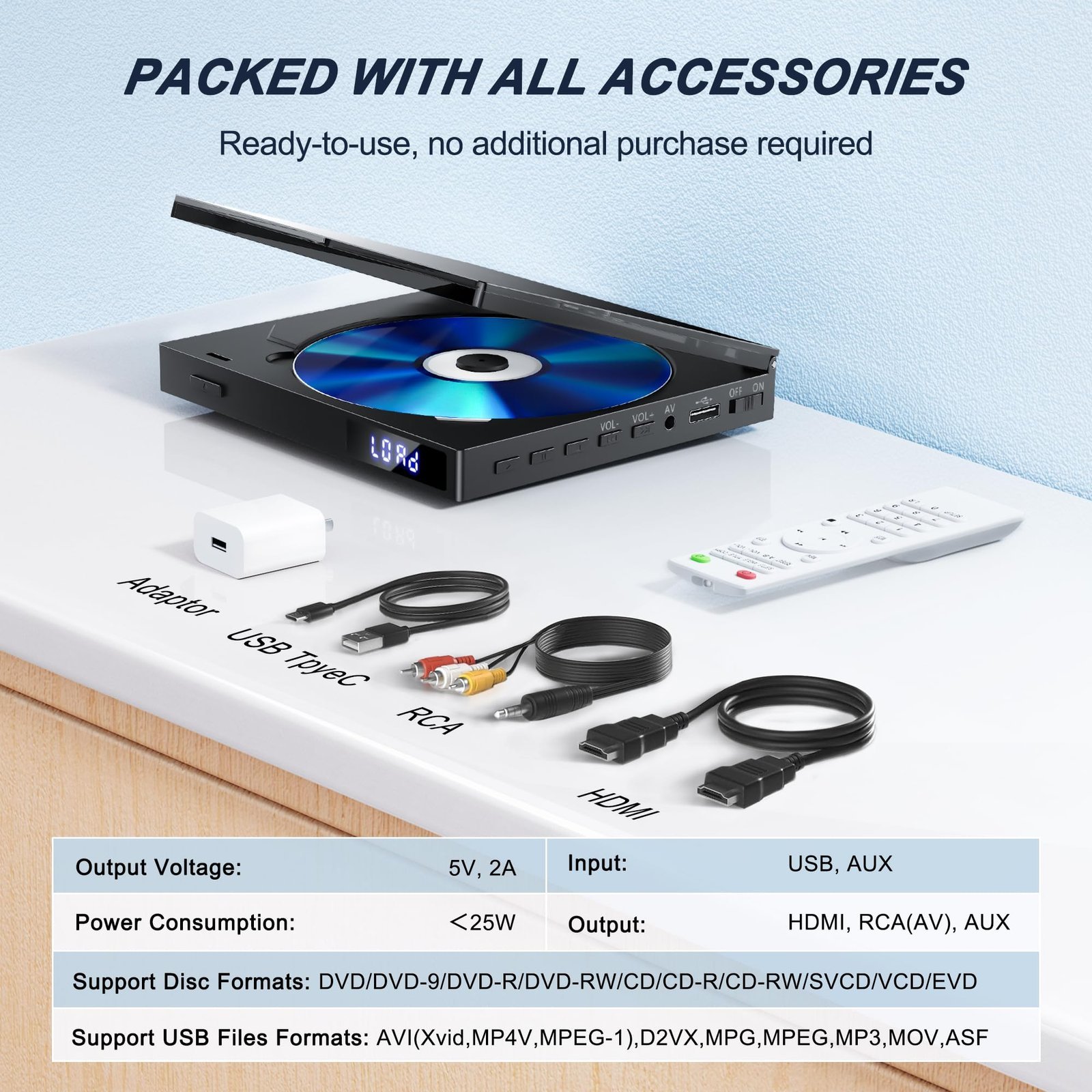 - [Package includes]: 1 x mini DVD player, 1 x remote control [batteries not included], 1 x 1M 4K/60Hz HDMI cable, 1 x 1M 4K/60Hz AV output cable, 1 x standard adapter, 1 x charging cable and 1 x user manual.