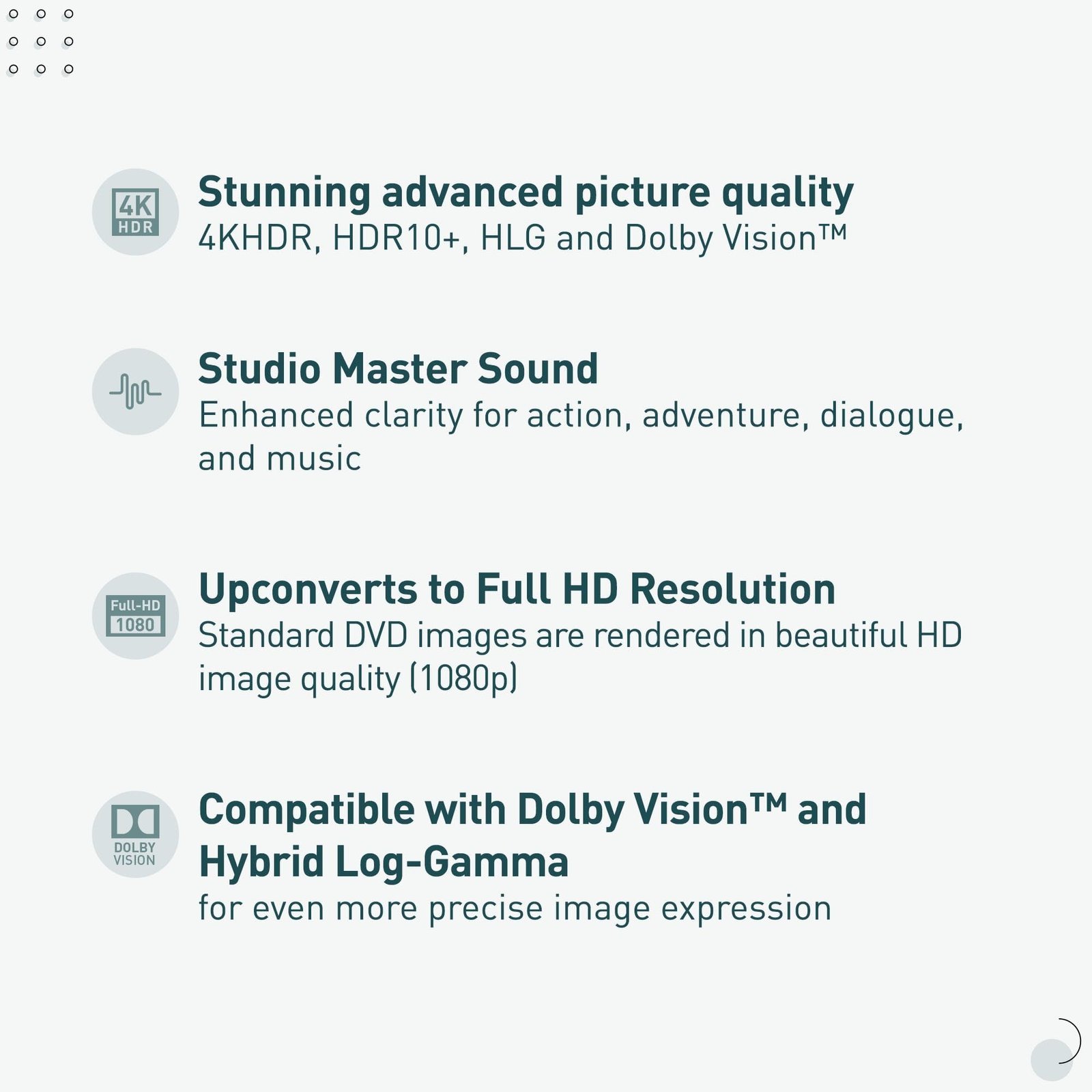 - Premium 4K Ultra HD Blu Ray Player for a Spectacular Home Theater Experience: Enjoy your library of special-edition Blu Ray, rare DVDs, or streamed content in true cinematic style with immersive video and audio