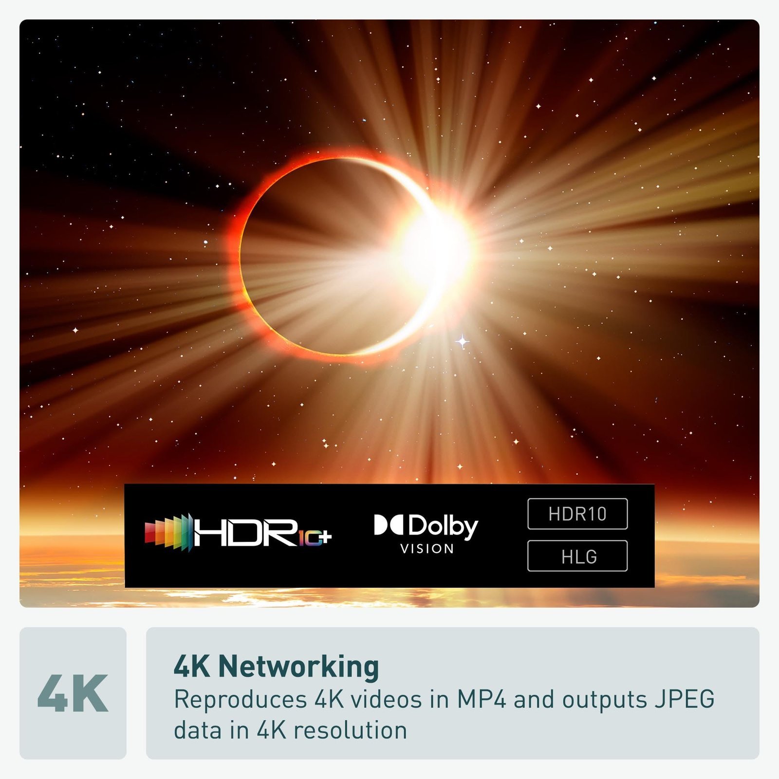 - 4K Networking: reproduce 4K videos in MP4 and you can output JPEG data in 4K resolution, to share photos from a camnera or camcorder