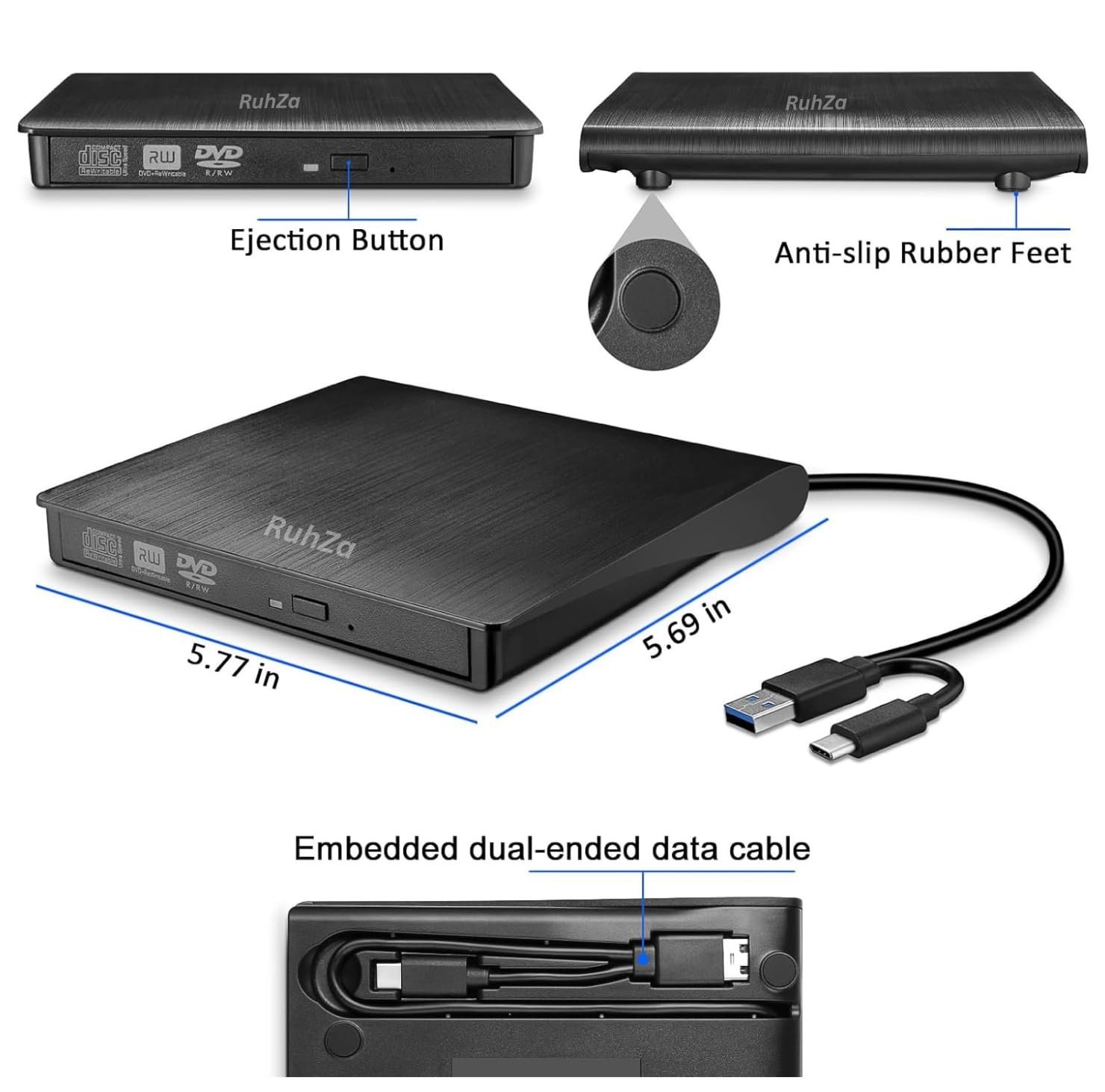 - 𝗛𝗶𝗴𝗵 𝗤𝘂𝗮𝗹𝗶𝘁𝘆 𝗖𝗵𝗶𝗽 & 𝗙𝗮𝘀𝘁 𝗣𝗿𝗼𝗰𝗲𝘀𝘀𝗶𝗻𝗴 𝘄𝗶𝘁𝗵 𝗟𝗮𝘁𝗲𝘀𝘁 𝗧𝗲𝗰𝗵𝗻𝗼𝗹𝗼𝗴𝘆: This RuhZa external CD/DVD drive uses the latest high-quality chip, which ensures faster data processing and improved accuracy. The advanced chipset allows for an incredibly smooth read for not only efficient business tasks but also for entertainment applications. Just plug into your computer with a USB 2.0/3.0 port or Type-C port and you can use this external drive immediately. No extern