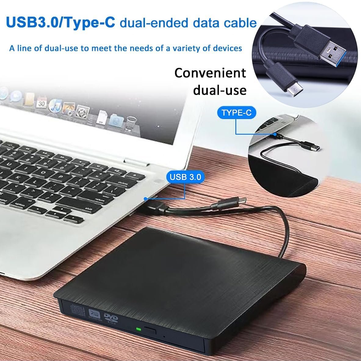 - 𝗨𝗦𝗕 𝟮.𝟬/𝟯.𝟬 + 𝗧𝘆𝗽𝗲-𝗖 𝗽𝗼𝗿𝘁 & 𝟴𝗫𝗗𝗩𝗗 + 𝟮𝟰𝗫𝗖𝗗: The dual USB and Type-C interface makes it easy to connect to a variety of devices and provides the convenience of quick plug and play. This amazingly fast external CD/DVD drive allows you to read and write DVDs up to 8x and CDs up to 24x Even if there is a large amount of data, it is ready to be processed. Whether it’s important business or leisure time, its efficiency and speed will exceed your expectations