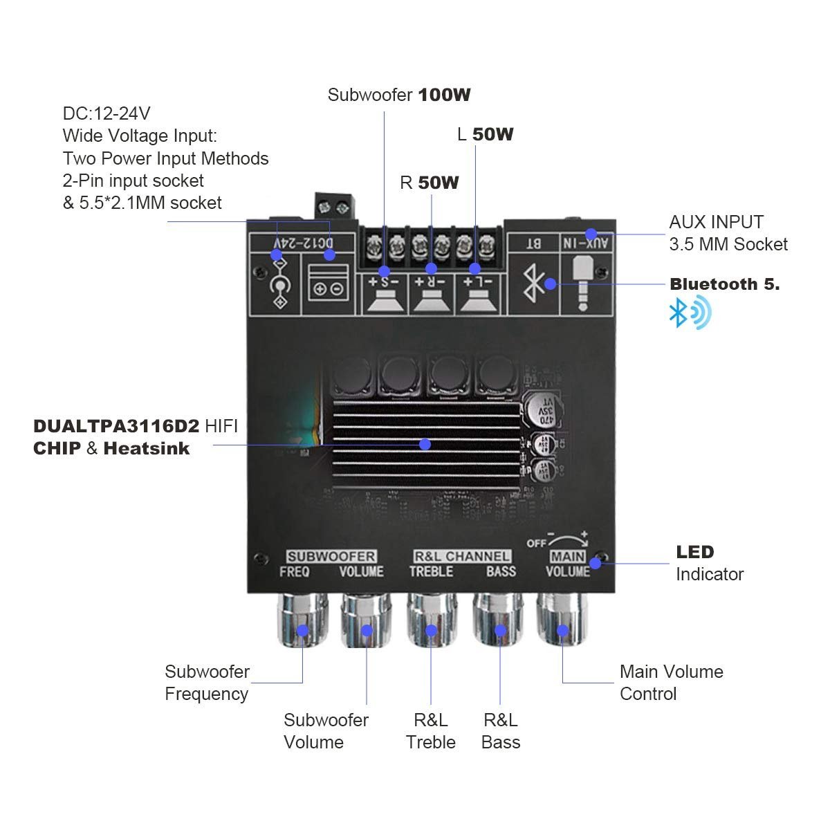 - 【Parameters】 Input voltage: DC 12V-24V; Maximum output power: 50W x 2 (R&L) + 100W (subwoofer); Input method: Bluetooth and AUX; Channel: Stereo output 2.1 CH; Output impedance: 4-8Ω; Bluetooth version: BT 5.0